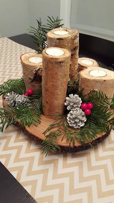 I had quite a bit of birch left over after I trimmed the pieces I needed for my planter so I had husband make me some candle holders. All you need to do is cut the birch to size and drill a hole for the tealight candle. I made 2 arrangements with the candles. The first one is simply just placed on top off a super cute wooden charger plate. I dressed it up with some Christmas tree greens, berries and acorns!